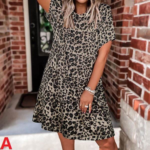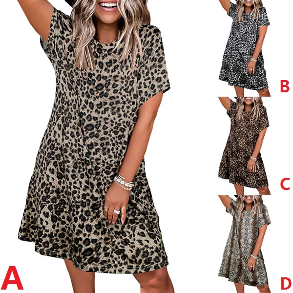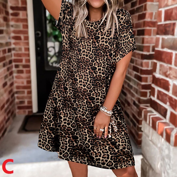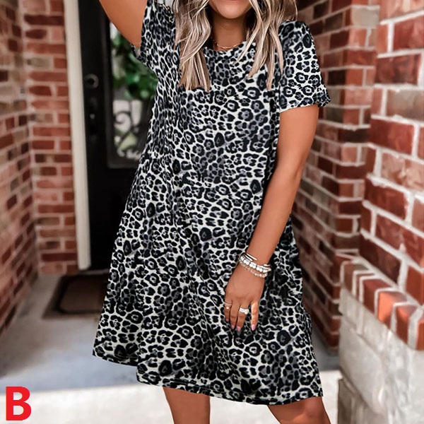 Fashion Short Sleeve Round Neck Leopard Printed Loose Dress