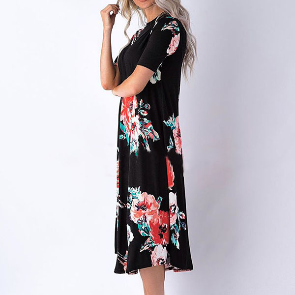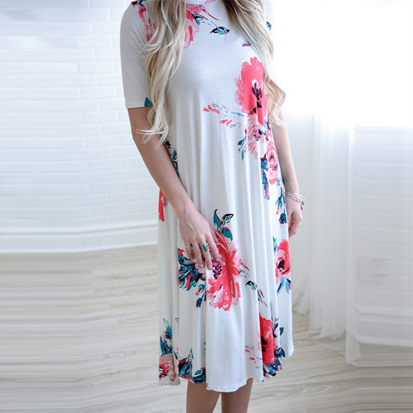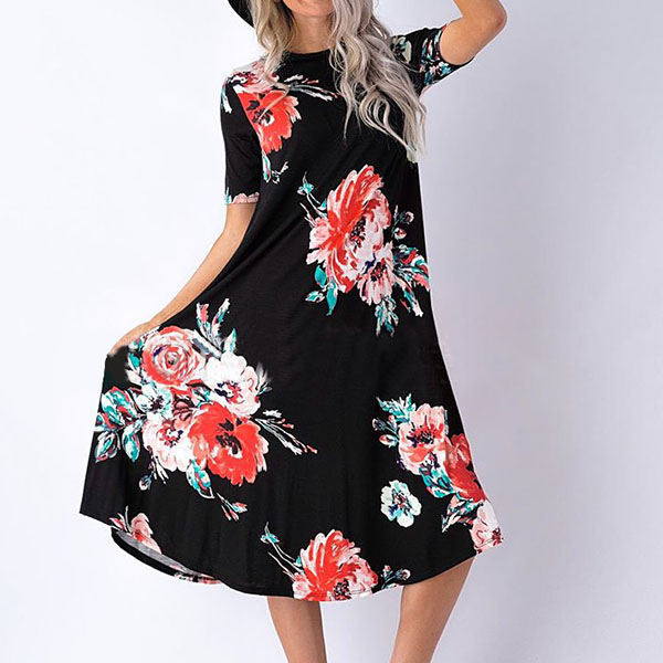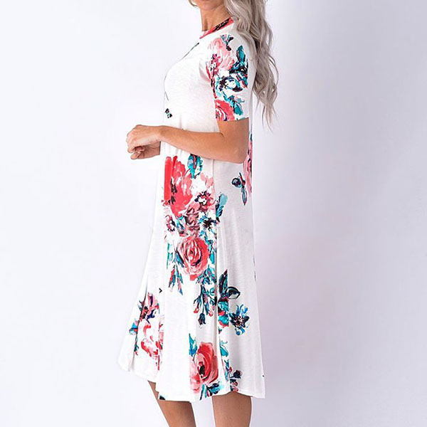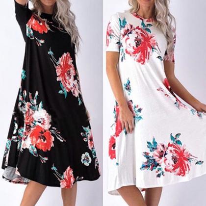 Boasts vibrant floral print,accompanied with short sleeve,round neck and a loose silhouette,this simple and