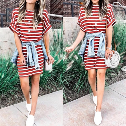 Fashion Short Sleeve Round Neck Striped T-shirt Dress