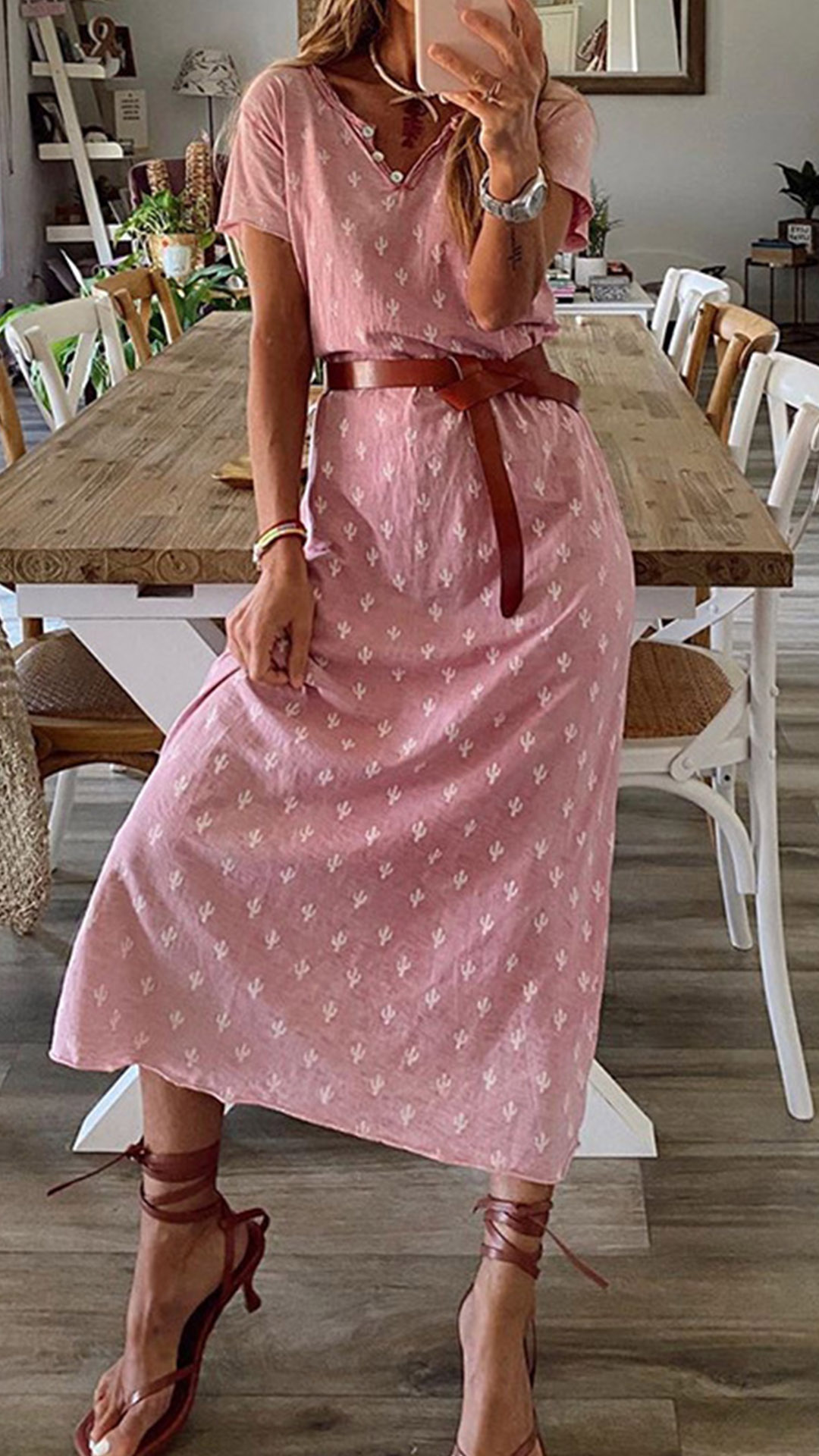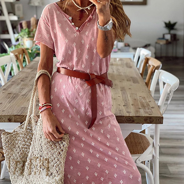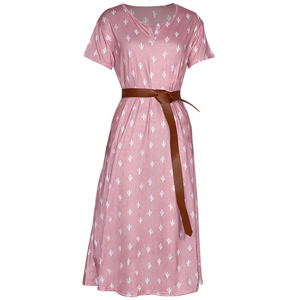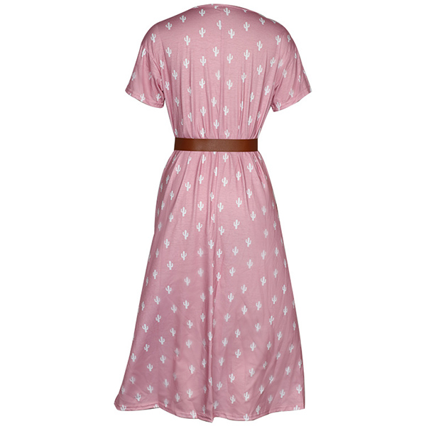Fashion Short Sleeve V-neck Cactus Printed Pink Dress with Waistband