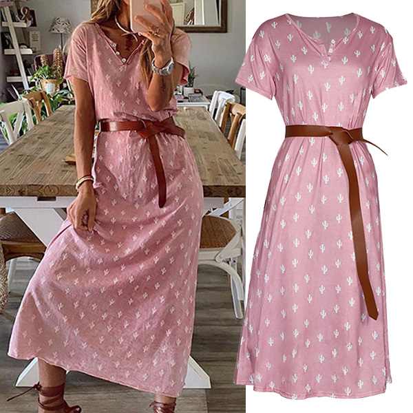 This dress comes with a sweet pink tone,decorated with the cactus printed pattern,which is perfect fit for your summer days. Crafted from soft and breathable fabric,with short sleeve and v-neck design,this dress also can ensure you a comfortable day. Comes with a waistband design,which can offer you a more charming look.