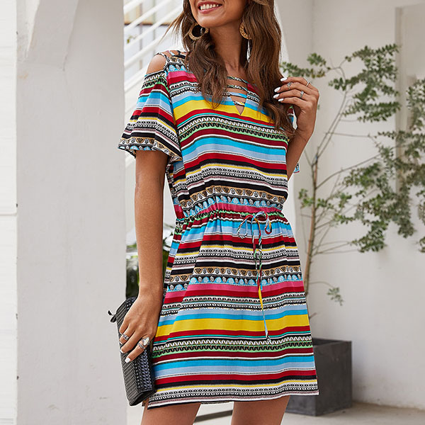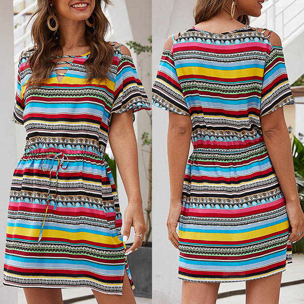 Make your simple and dull wardrobe look more colorful by adding this dress. The colorful stripe element design makes this piece look so stylish and eye-catching. Finished with short sleeve,v-neck and a drawstring waist,this piece can offer you a cozy yet stylish style.