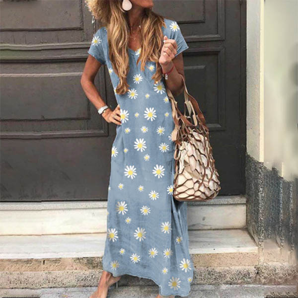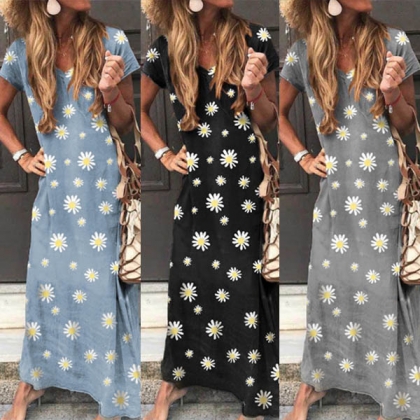 Fashion Short Sleeve V-neck Daisy Printed Dress