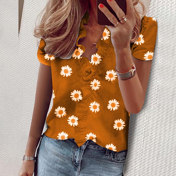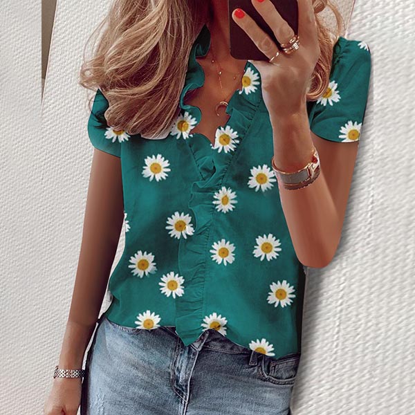 Fashion Short Sleeve V-neck Daisy printed Ruffle Blouse
