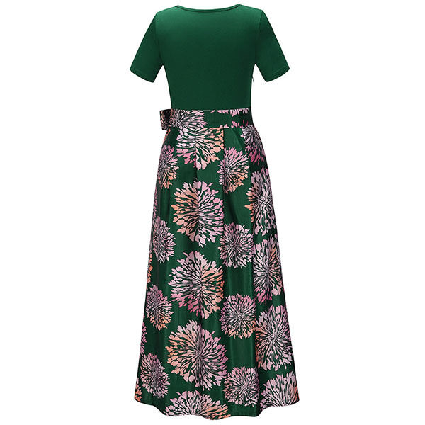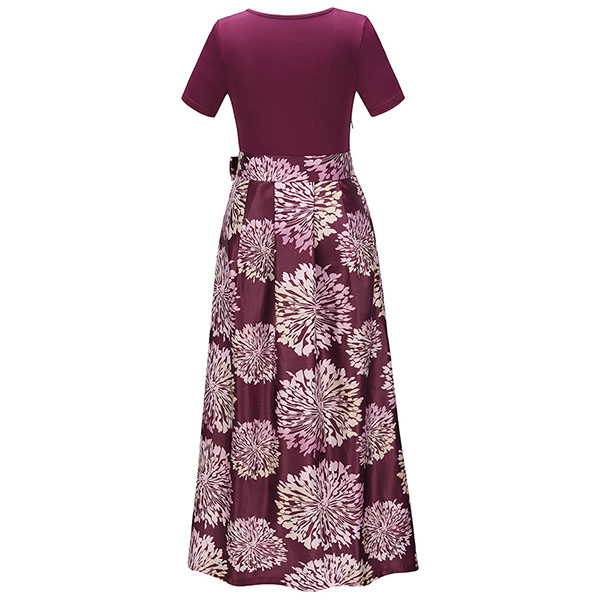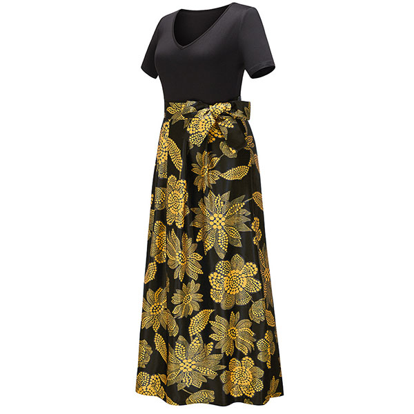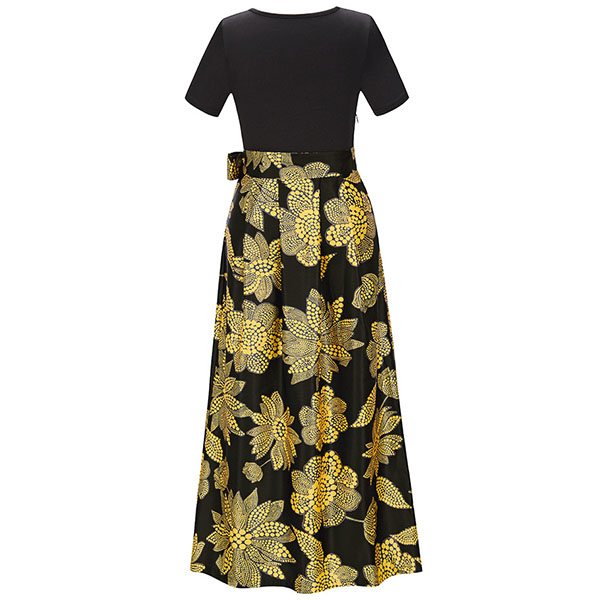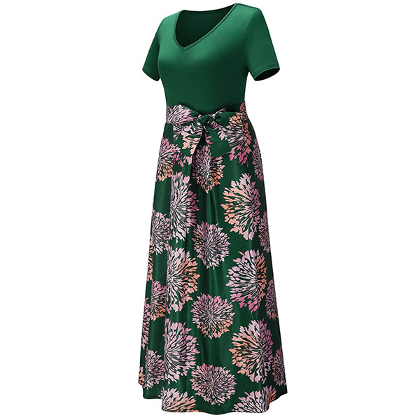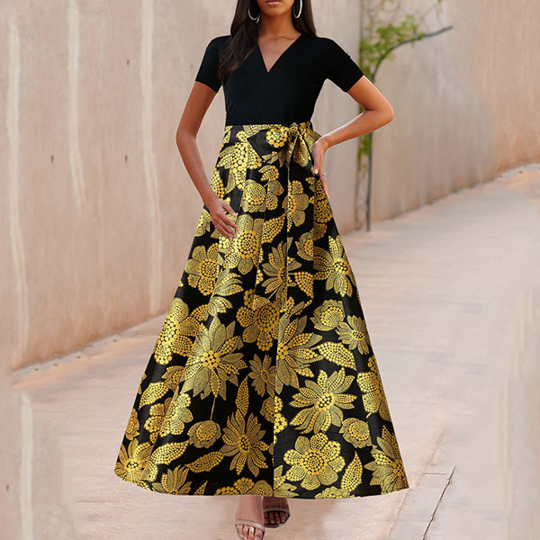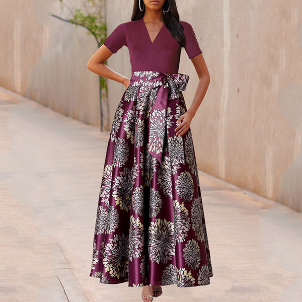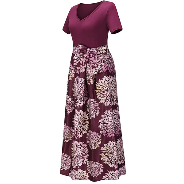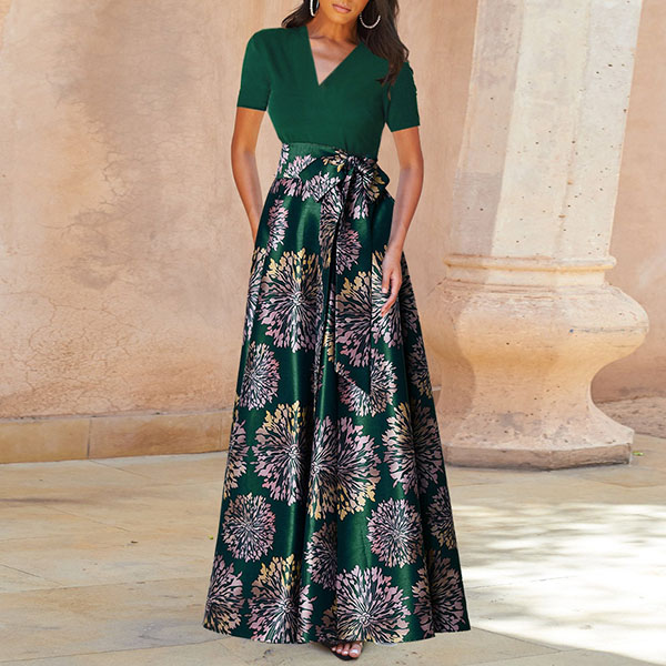 Take an interest with this dress to give your wardrobe an update. It is finished with short sleeve,v-neck,high waist and a maxi length,this dress can showcase your slender figure. Moreover,the printed spliced hem design will make this piece look more eye-catching. You can look effortlessly charming and beautiful in this dress.