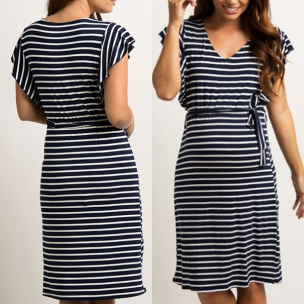 Fashion Short Sleeve V-neck Lace-up Striped Dress for Pregnant Woman
