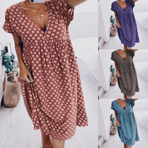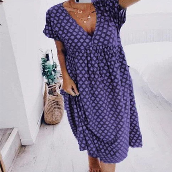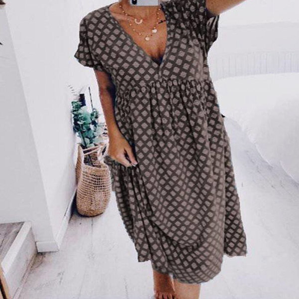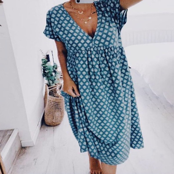 For your weekend strolling and night walking,this simple,casual and relaxed dress is your good choice. It is finished with short sleeve,v-neck and a loose silhouette,this dress is sure to give you a comfortable day. The chic printed details will add some extra charm. So why not take interest in it?