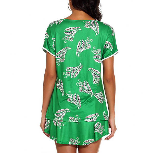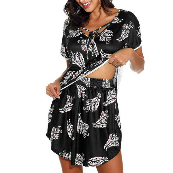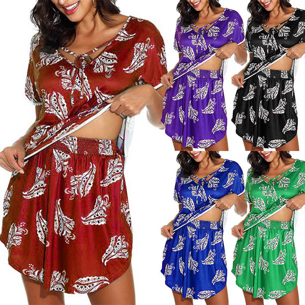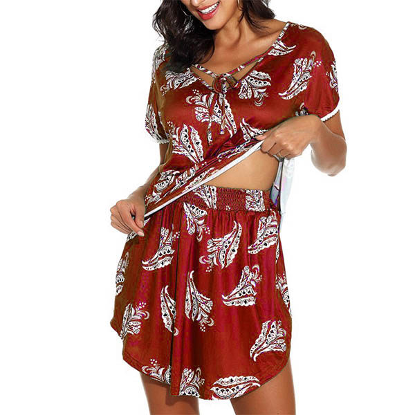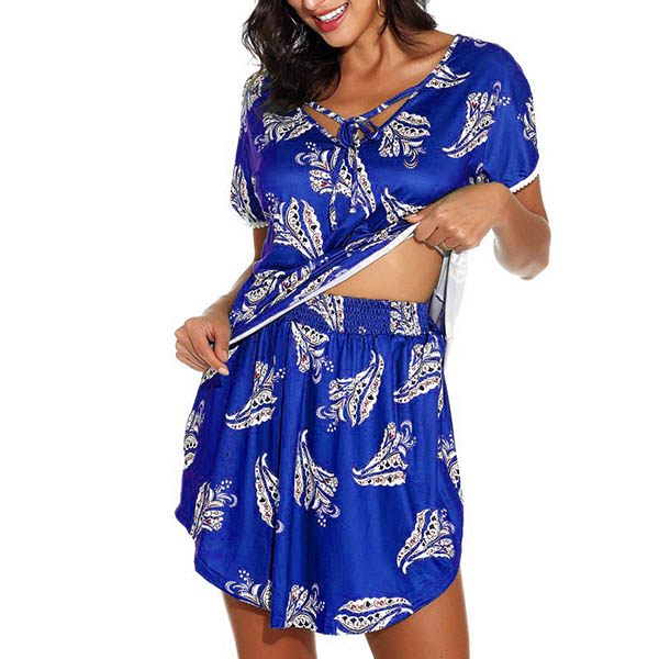 When you are lazy to don your wardrobe matching,then this two-piece set would be a perfect solution. Its chic printed details make them look more eye-catching. Including a short sleeve v-neck top and a short,this two-piece set can ensure the comfy while it exude your personality.