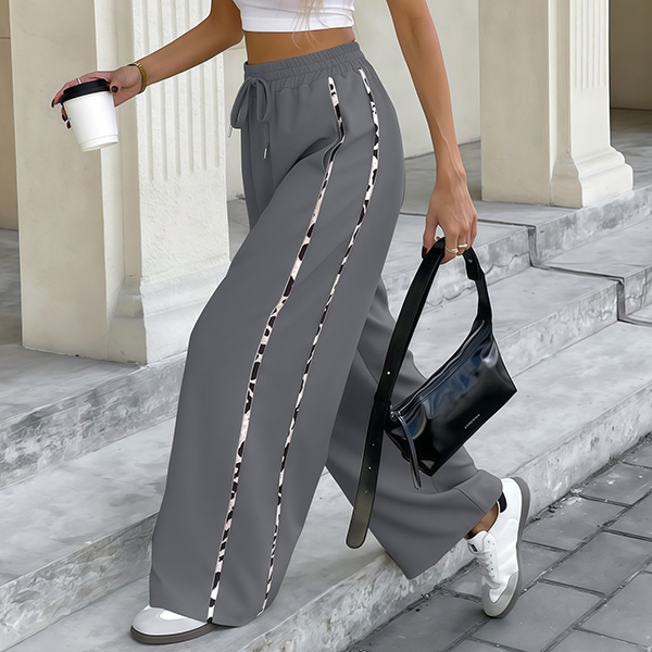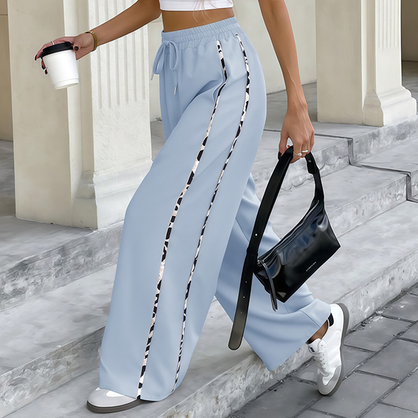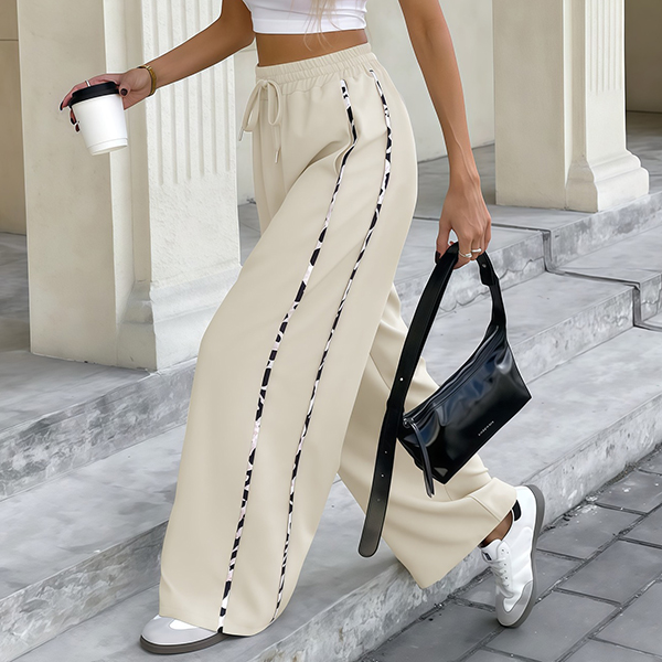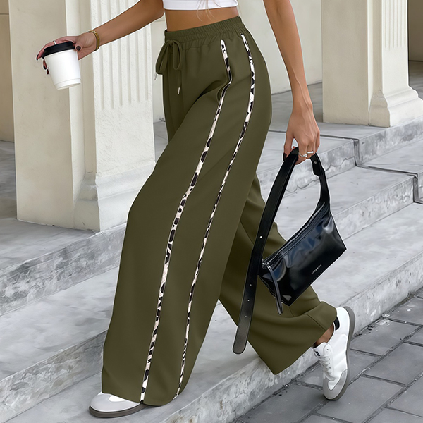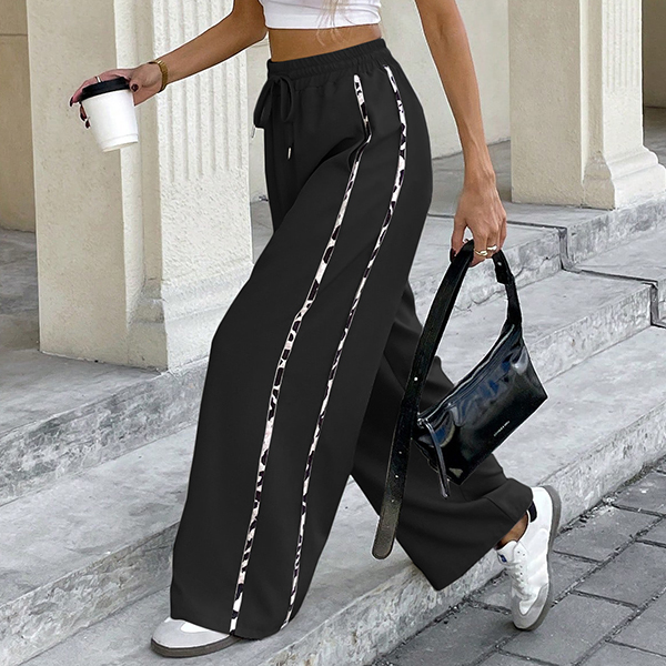 Fashion Side Leopard Printed Stripe Drawstring Waist Wide-leg Pants