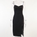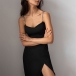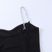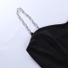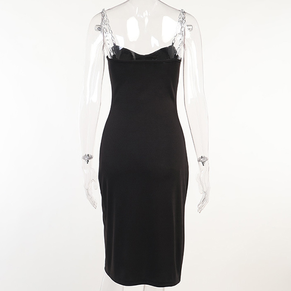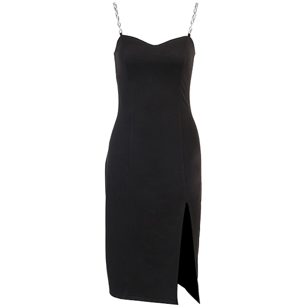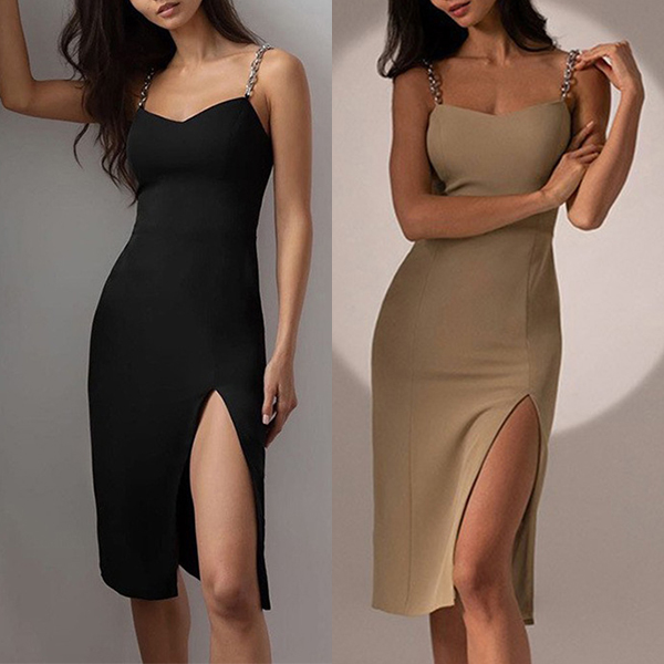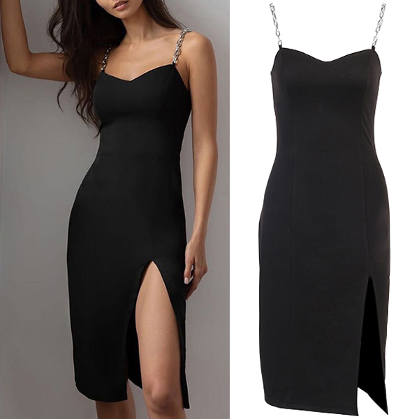 This dress combines sophistication and edginess with its side slit design, chain shoulder straps, and figure-flattering silhouette, creating a captivating and glamorous ensemble that is sure to make a statement.