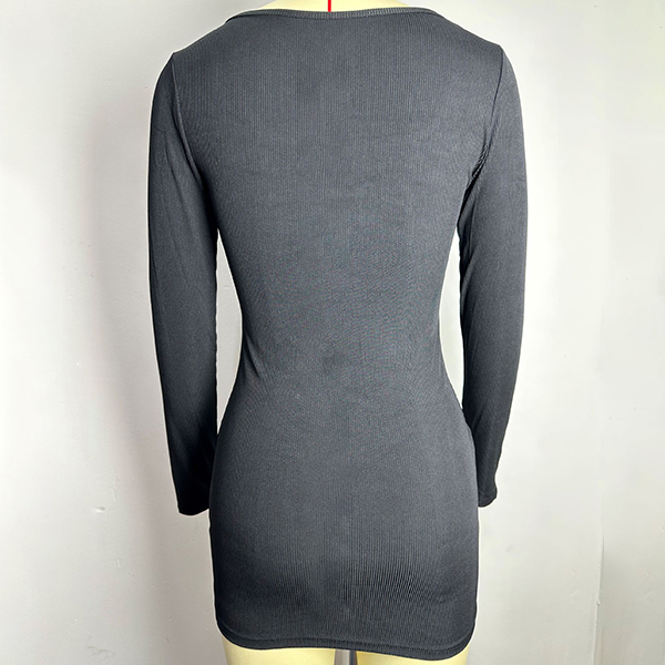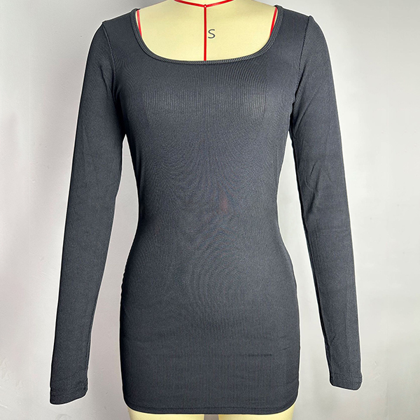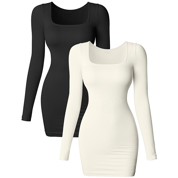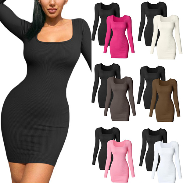 Fashion Simple Square Neck Long Sleeve Ribbed Bodycon Dress