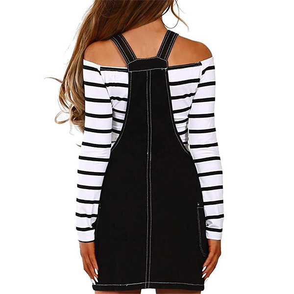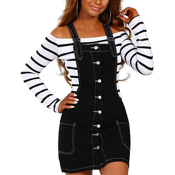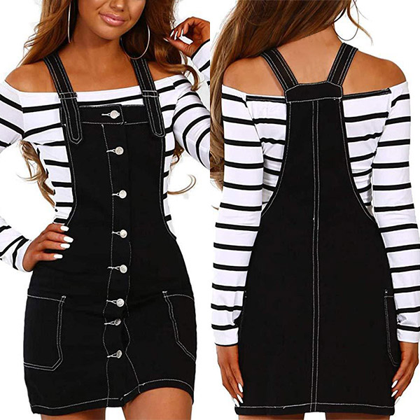As for a youthful,playful yet stylish daily style,you can have a try this denim suspender skirt. The single-breasted design enriches the design style,while its soft,breathable fabric and adjustable shoulder strap design can give you an utmost comfort. You can simple match with your t-shirt to have a laid-back and fashionable daily look.