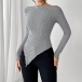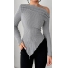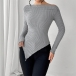 This gray shirt features a slant shoulder design, long sleeves, an irregular hemline, and ribbed detailing, creating a stylish and fashion-forward look that is perfect for making a statement. Pair with jeans and sneakers for a casual look.