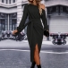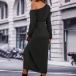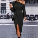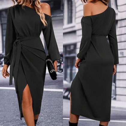 Fashion Slant Shoulder Long Sleeve Self-tie Slit Dress