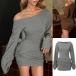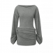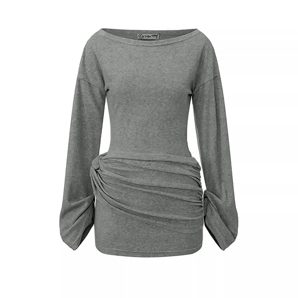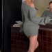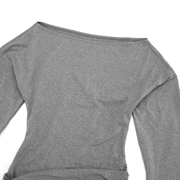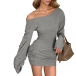 This gray mini dress features dramatic slant shoulder design with strategic ruched detailing and figure-flattering bodycon silhouette for contemporary asymmetrical elegance. Pair with heels and minimal jewelry for evening sophistication.