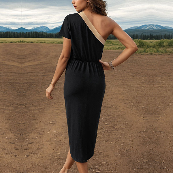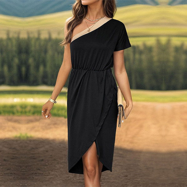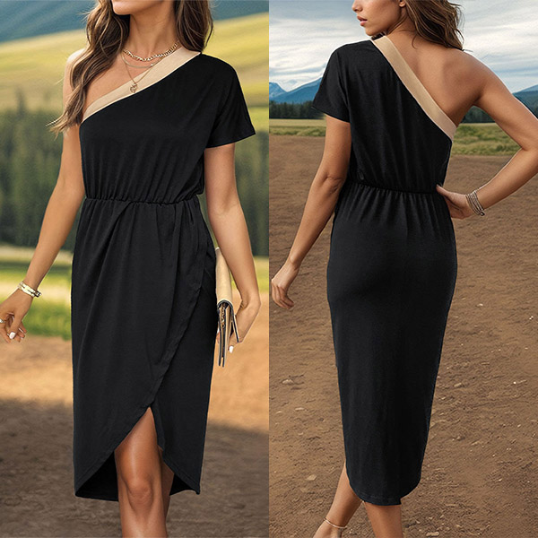 Look at this dress!The defining feature of this dress is the unique slanted shoulder silhouette. The asymmetrical neckline and uneven shoulder lend a modern, edgy twist to the classic dress silhouette. Pair it with strappy heels and statement jewelry for a night out on the town, or keep the look more casual with flat sandals and a denim jacket for a relaxed, daytime vibe.