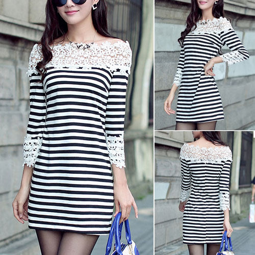 Striped style,chic and stylish. Slash neck design,with lace spliced,filled with