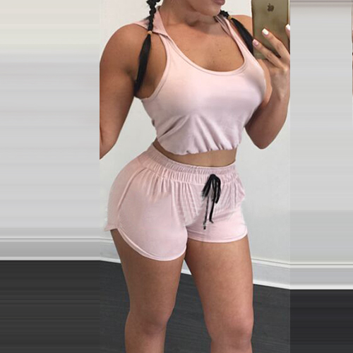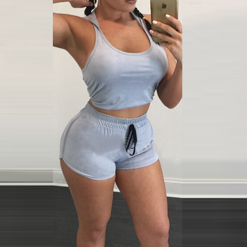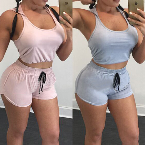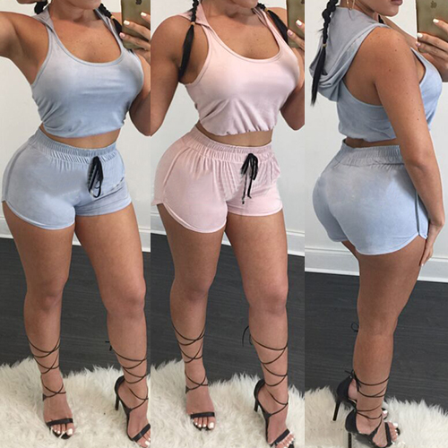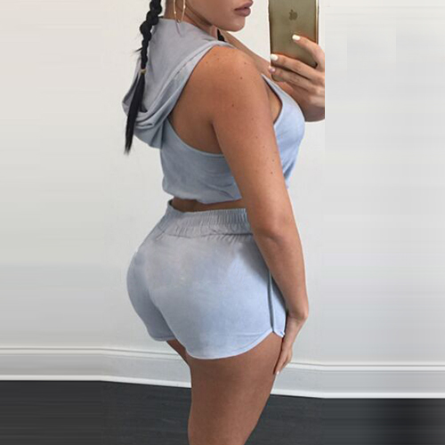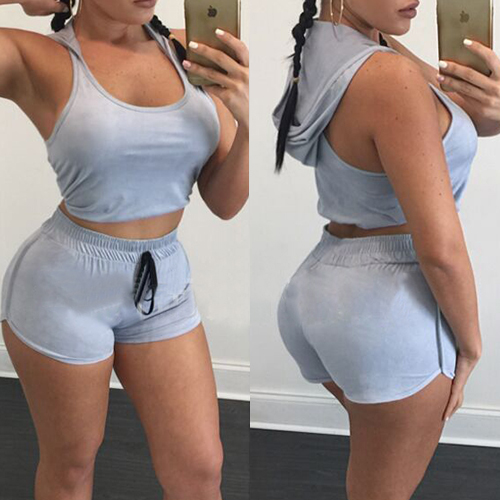 Fashion Sleeveless Hooded Crop Tops + High Waist Shorts Sports Suit