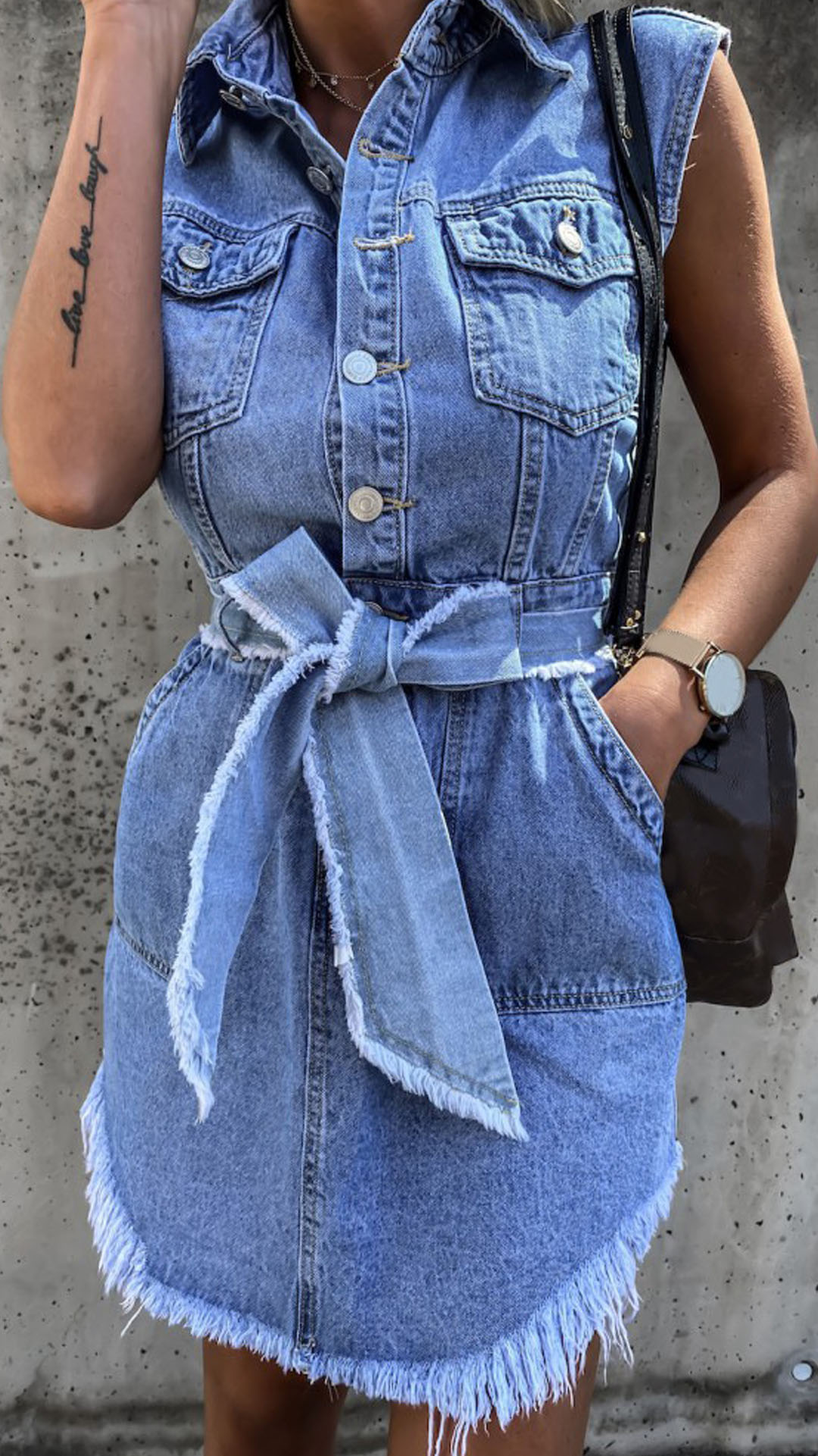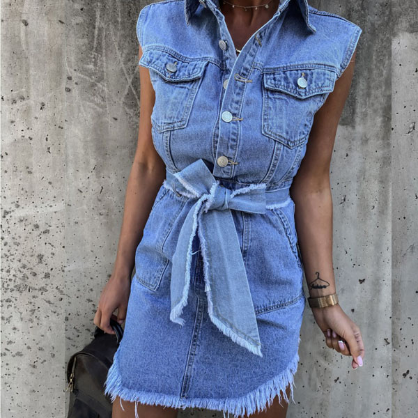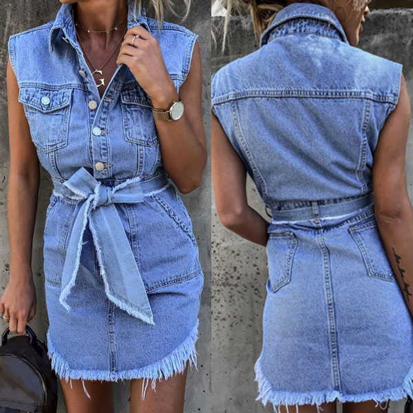 As for the summer days,this sleeveless denim dress would strike your mind. The irregular frayed hem design is the highlight,which makes this piece look so distinctive and attractive. Comes with a waist strap design,which can better showcase your slender figure. You can trust in this piece to update your daily style.