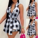 Fashion Sleeveless POLO Collar Irregular Hem Plaid Top + Shorts Two-piece Set
