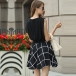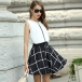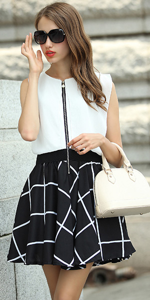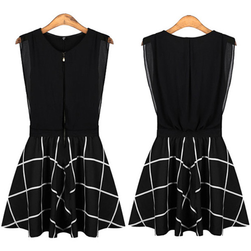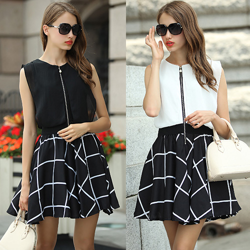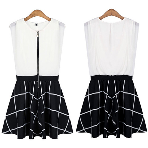 It features sleeveless and round neck design,front zipper closure. Flowing plaid hem makes
