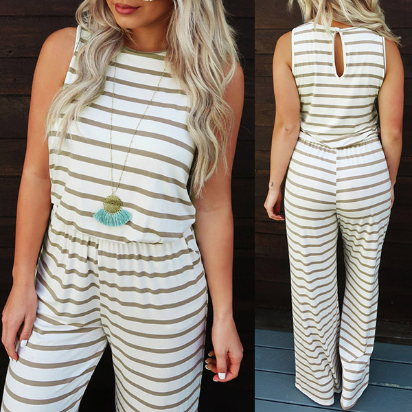 If you are tired of the dresses and t-shirts,then you can just have a look at this jumpsuit! The stripe element design can help you catch up with the latest fashion trend. Finished with sleeveless,round neck and high waist design,this piece is a good weapon to showcase your slender figure. For the hot summer days,this piece can be your wise choice.