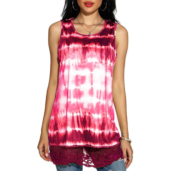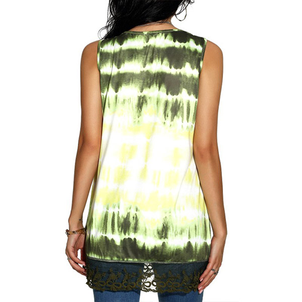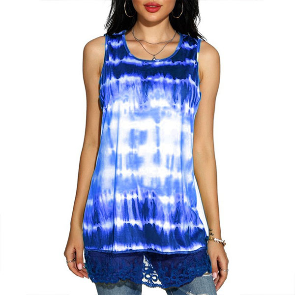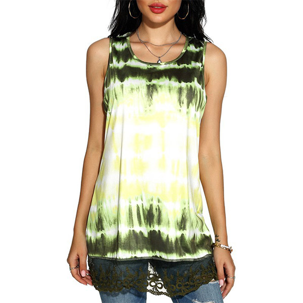 Fashion Sleeveless Round Neck Lace Spliced Hem Tie-dye Printed Top