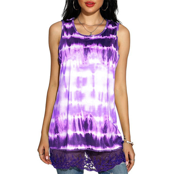 Your summer wardrobe will be more colorful by adding this wonderful top. The tie-dye printed details and lace spliced hem design make this piece look so attractive. Meanwhile,its soft and breathable fabric can ensure you a cool and comfortable day. Your perfect choice on these sun-soaked summer days.