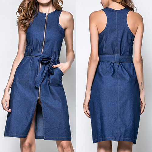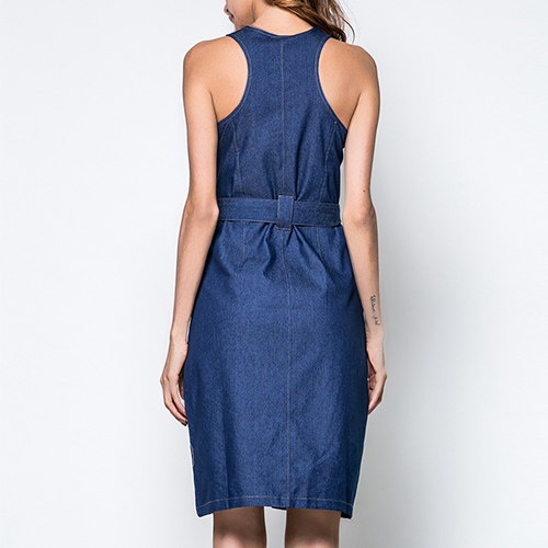 This denim dress is made to give you an effortless, long lasting impression. Styled with sleeveless,round neck and a