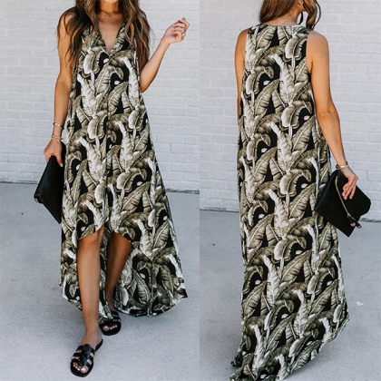 Fashion Sleeveless V-neck High-low Hem Printed Dress
