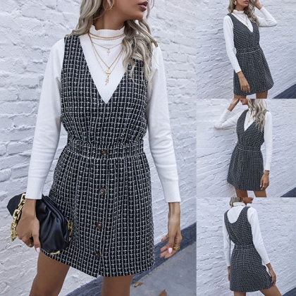 Fashion Sleeveless V-neck High Waist Plaid Dress