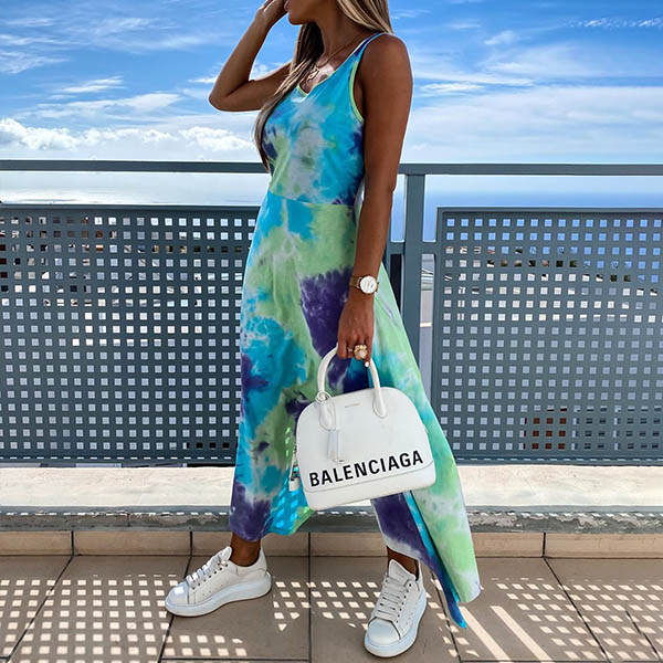 When you have this dress in your team, you never have to sacrifice style over comfort. The tie-dye printed details make this piece look so eye-catching and stylish. Finished with sleeveless,v-neck and slit hem design,this dress is sure to make you be a pleasant sight to draw more attention.