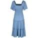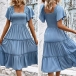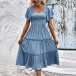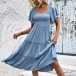 Fashion Smocked Bodice Solid Color Square Neck Short Sleeve Ruffled Tiered Dress
