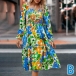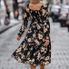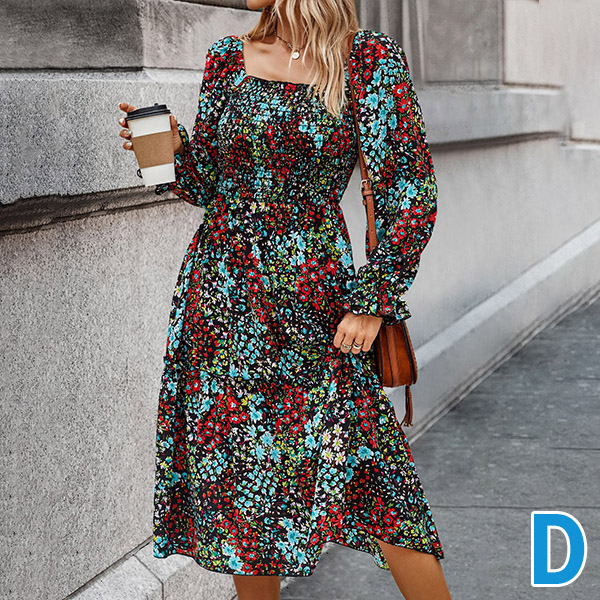 How about this dress? The printed fabric adds a lively and fashionable element to the dress, making it perfect for various occasions. The square neckline adds a touch of elegance, while the long sleeves provide both coverage and style. The midi length falls below the knee, offering a versatile and sophisticated look.
