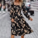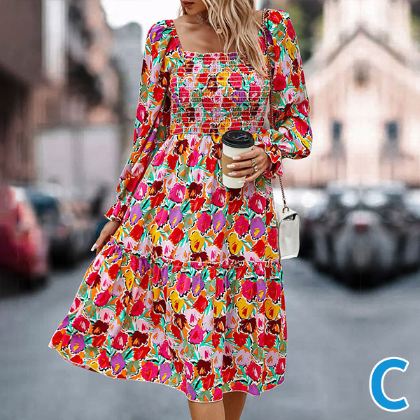Fashion Smocked Printed Square Neck Long Sleeve Midi Dress
