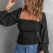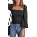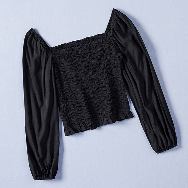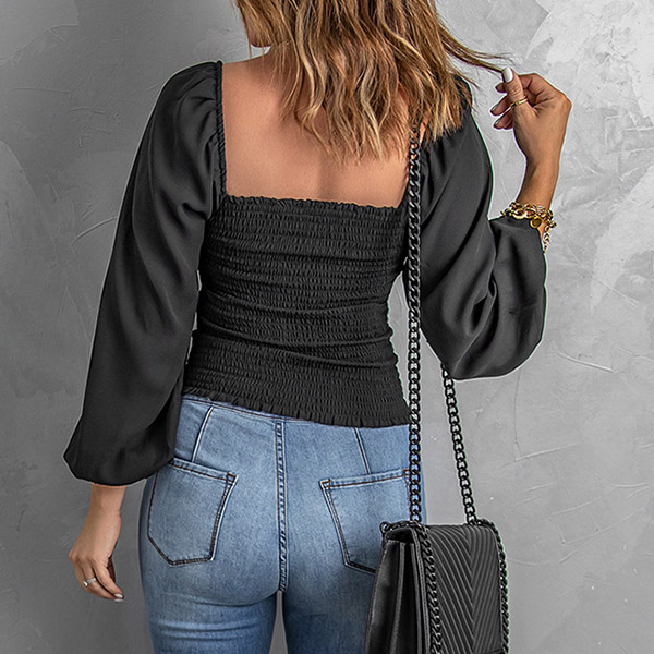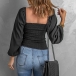 Fashion Smocked Square Neck Long Sleeve Black Shirt