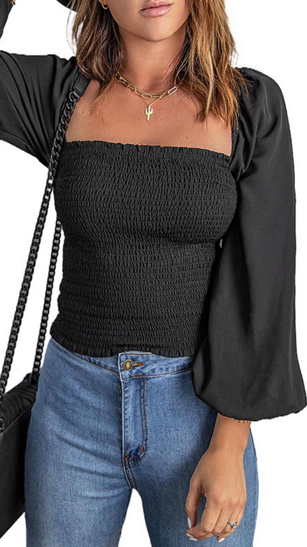 This long sleeve black shirt is the perfect addition to your wardrobe. The square neckline and smocked design are stylish and flattering. Wanna have a try?