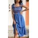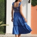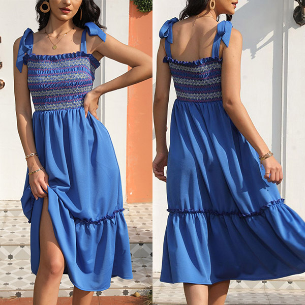 This tiered dress features contrast color smocked bodice and self-tie shoulder strap, midi-length and fit & flare silhouette make it looks casual and chic.