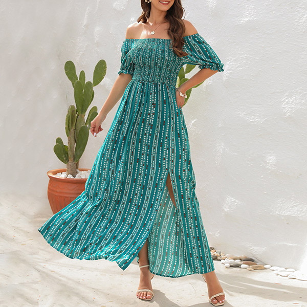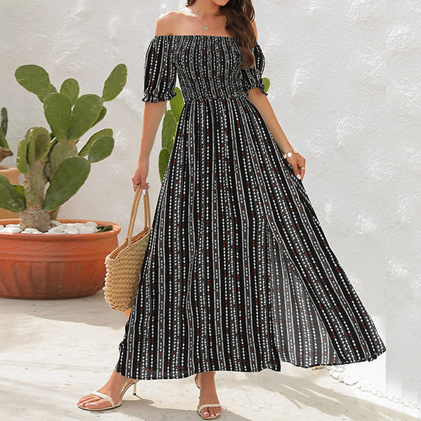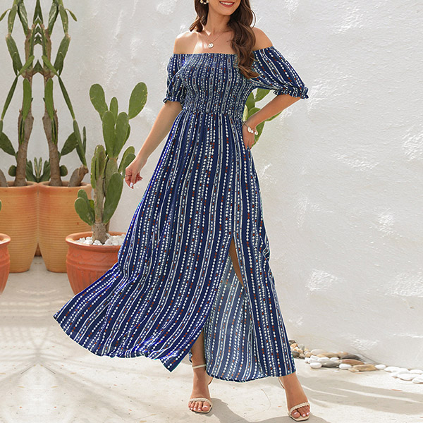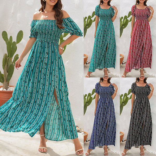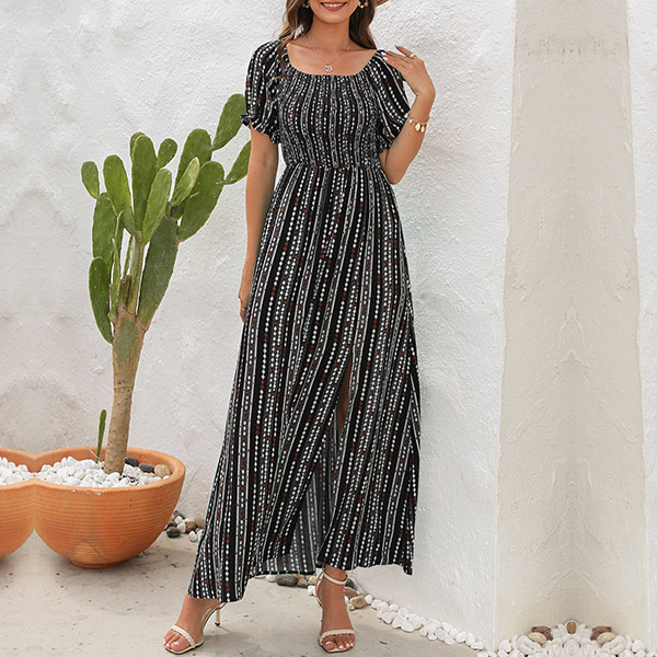 This dress combines trendy vertical stripes, smocked details, and a flattering silhouette to create a stylish and versatile piece. The smocked bodice adds a touch of texture and allows for a comfortable and flexible fit that accentuates your curves.The slit on the side adds a hint of allure and allows for easy movement, making this dress perfect for both casual and dressier occasions.