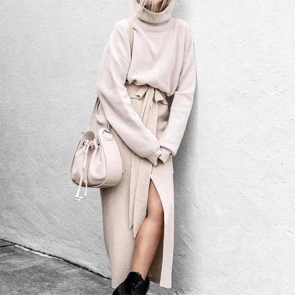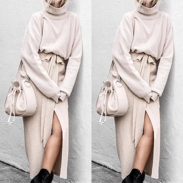 Inject some fresh blood to your wardrobe with this two-piece set. Solid color style,including a long sleeve turtleneck top and a high waist slit hem skirt,this two-piece set knows how to boost your entire charm while it upgrade your style.