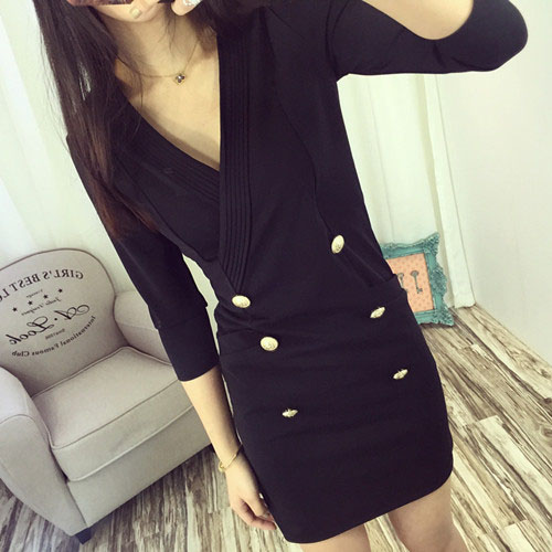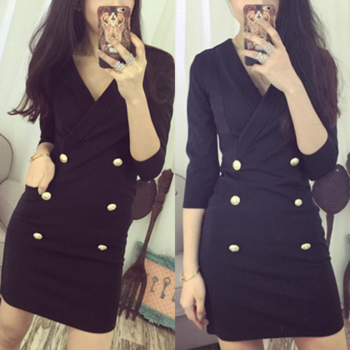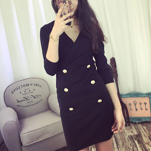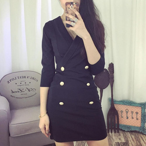 It is characterized by solid color, with v-neck, 3/4 sleeve, decorative double-breasted and slim fit design.