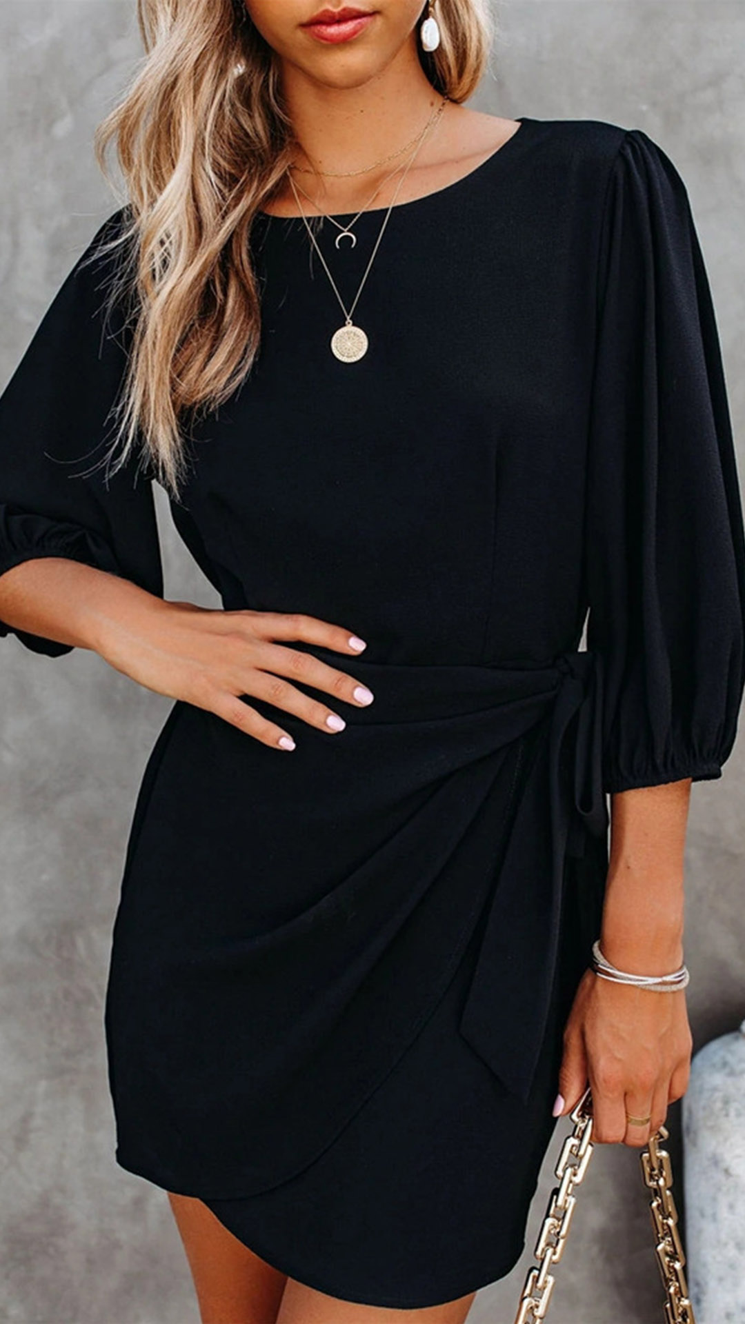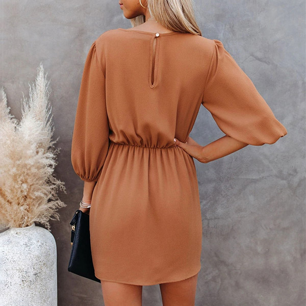 Fashion Solid Color 3/4 Sleeve Round Neck Lace-up Dress