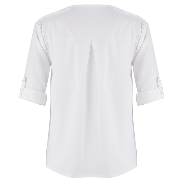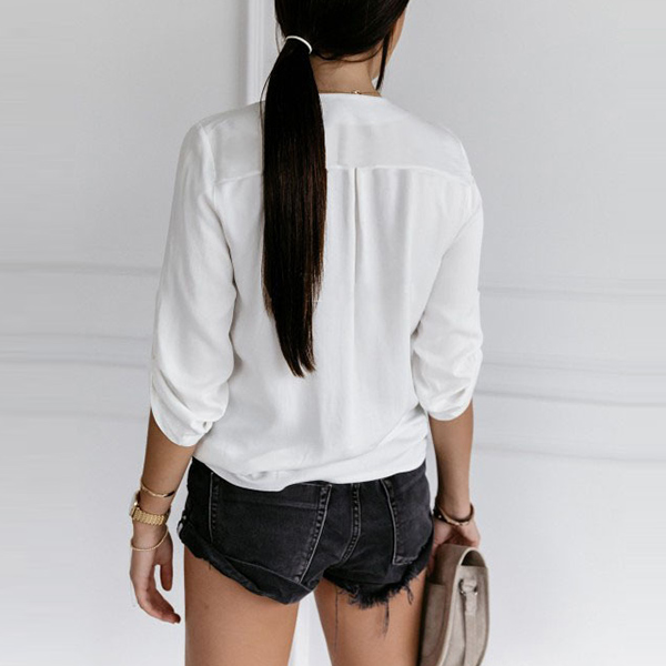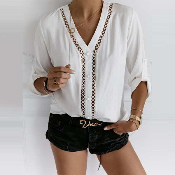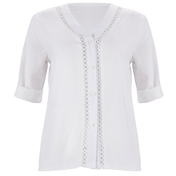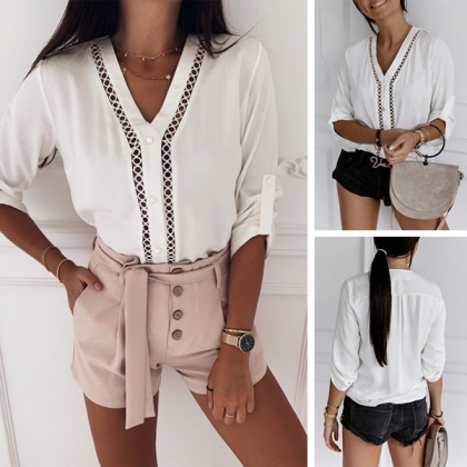 This blouse features a classic yet stylish white tone,the v-neck and hollow out details can help exude your sexy and feminine appeal,while its soft fabric and loose silhouette design will promise you a comfortable day. Perfect fit for matching with different style bottoms like shorts,skirts,jeans and so on.