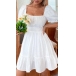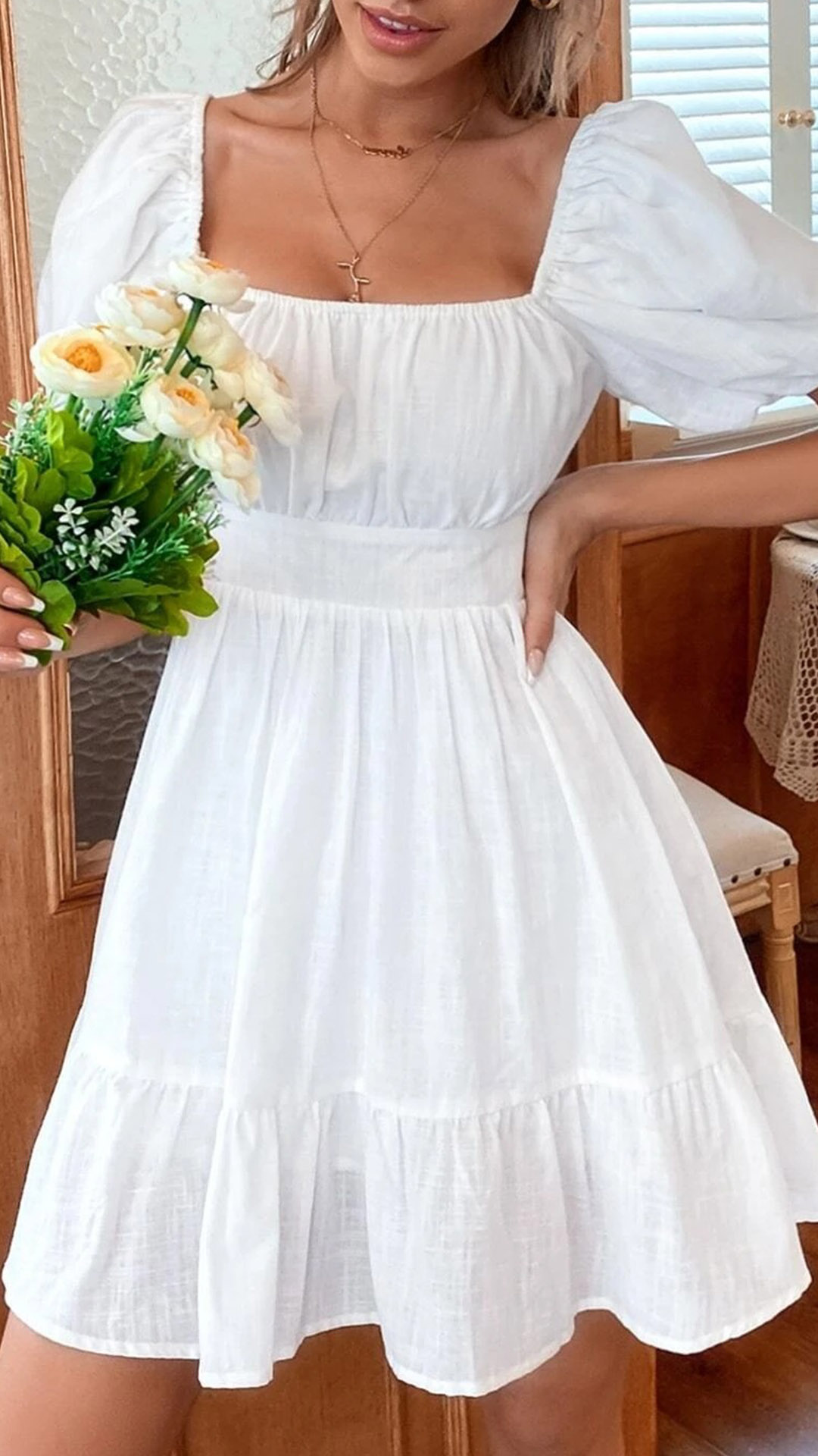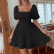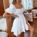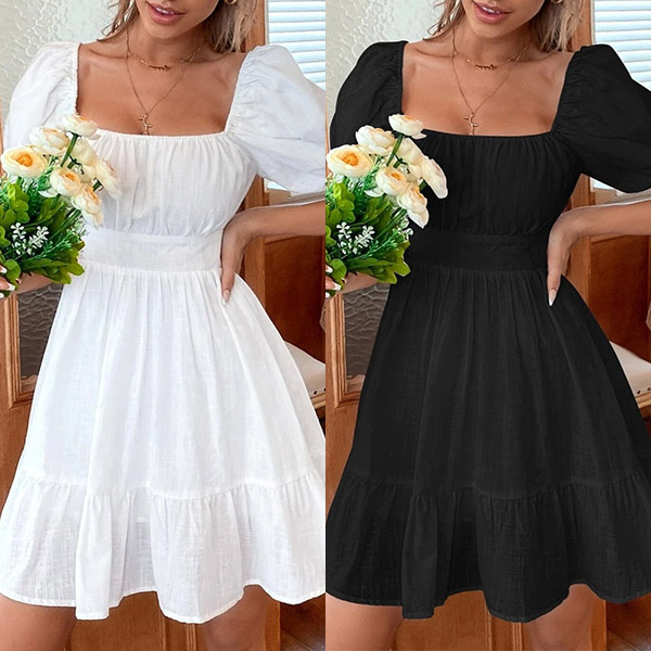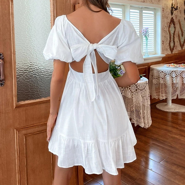 Mini dress featuring straight-cut neckline, backless with back-tie bow knot, short sleeve, tiered skirt, wanna have a try?
