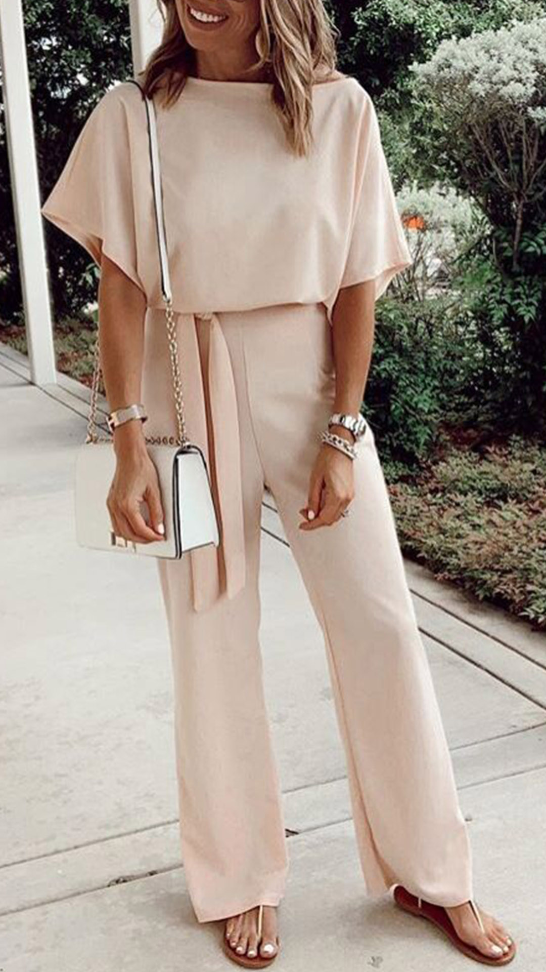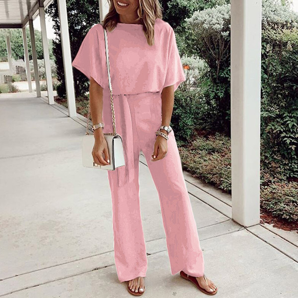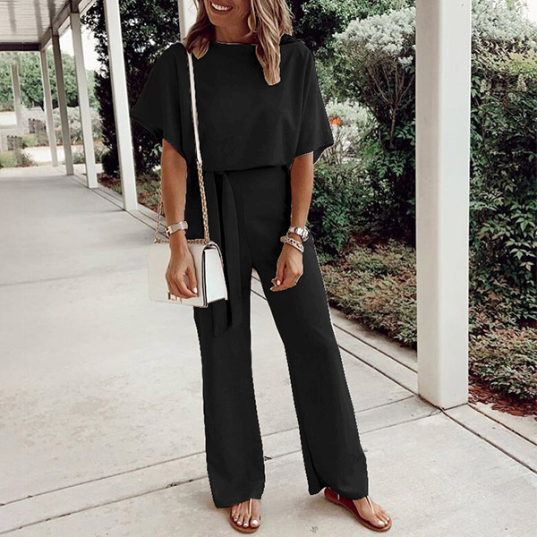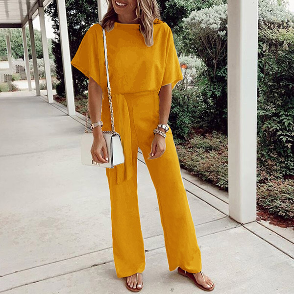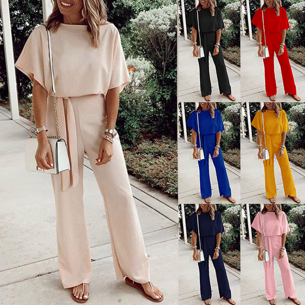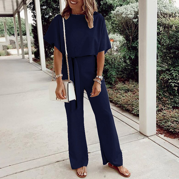 This fashionable and comfortable jumpsuit is perfect for any woman on the go! The solid color and batwing sleeves make it versatile for any occasion, while the self-tie and wide leg provides a stylish and flattering fit.