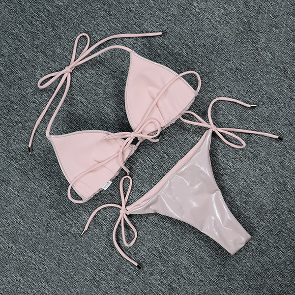 Fashion Solid Color Bikini Set consist of Halter Bikini Top and Self-tie Low Waist Bikini Bottoms