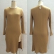 The dress is styled with solid color bracelet sleeve design and irregular slit hem patterns, which would be
