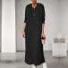 Fashion Solid Color Button V-neck Drawstring Long Sleeve Ribbed Long Dress