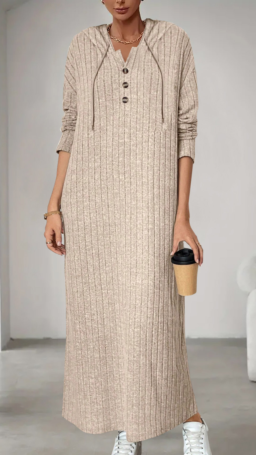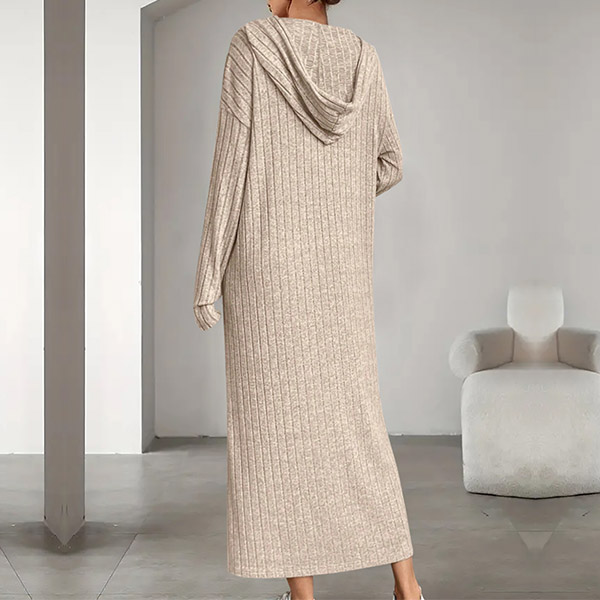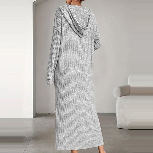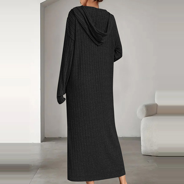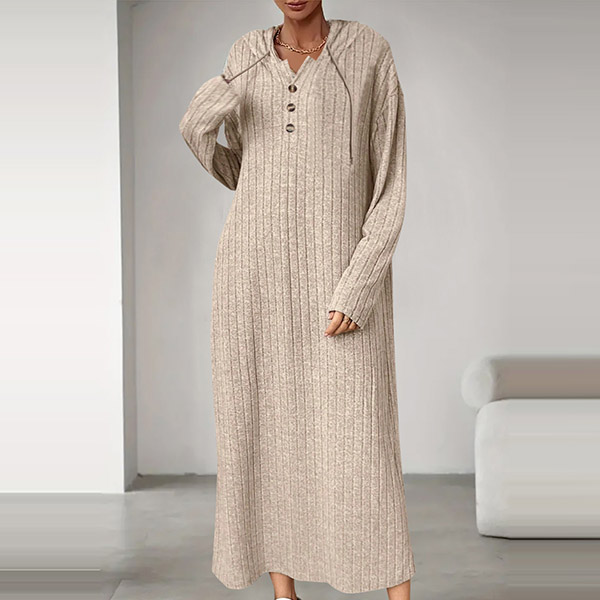 This maxi dress features button-up V-neck design, drawstring hooded, long sleeves, ribbed texture, and a classic solid color for a stylish and comfortable look.