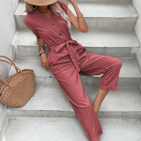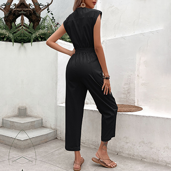 Fashion Solid Color Button V-neck Sleeveless Jumpsuit